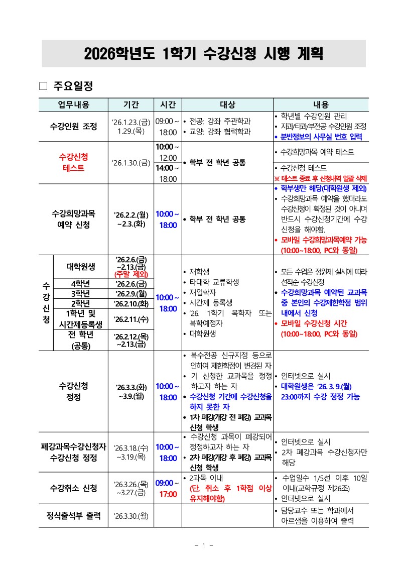 - 수강신청 테스트: ‘26. 1. 30.(금) 14:00 ~ 18:00